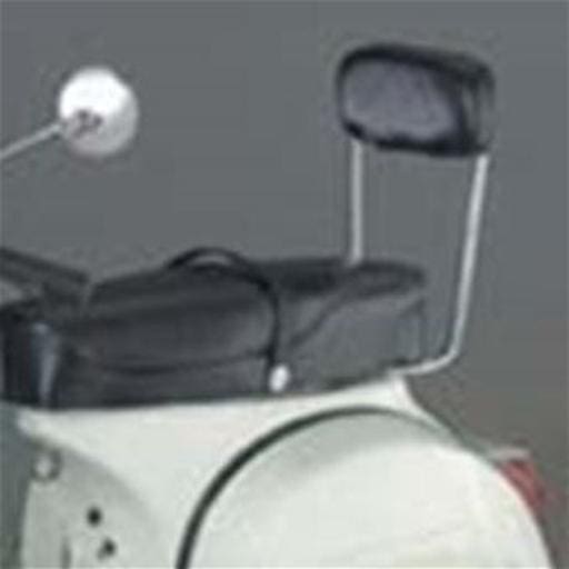 DESCRIPTION: Help your passenger feel more secure. Chrome backrest with pad bolts to frame underneath the seat. Fits Stella and all large frame Vespas after 1960 except VSB, VSD, VSE and VSC (the tall fuel tank gets in the way on these models). When installing on a Stella/PX, we recommend a longer check pin as it allows for the seat to clear the bars. Measures 16in high