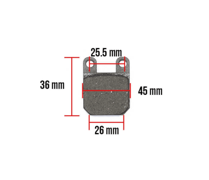 DESCRIPTION: Stock replacement brake pads fit the following models: CPI Enduro50 06-08 Front/Rear CPI Enduro250 07-08 Front/Rear Derbi Atlantis50 02-05 Front Derbi GP1 02-06 Front Derbi Atlantis Bullet 02-05 Front Italjet Dragster LC 98-03 Front/Rear Italjet Formula AC 99-03 Front Italjet Formula LC 96-03 Front/Rear Italjet Torpedo50 98-03 Front Italjet Formula125 LC 96-03 Front/Rear Italjet Torpedo125 4T 99-03 Front Italjet Torpedo150 4T 03 Front Peugeot Speedflight 02-05 Front Peugeot Jet Force 03-05 Front/Rear Peugeot XR6 03-05 Rear Peugeot Speedflight Race 03-05 Front/Rear Dimension A: 36 x 45 x 6mm Dimension B: 36 x 45 x 6mm