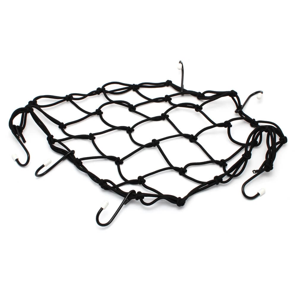 DESCRIPTION: A simple bungee cargo net with hooks to hold down helmets, bags, or other gear to your rack or seat. Very handy, and stores small!Original Parts For Scooters SKU 172-178Specifications: 13×13 unstretched 16×16 stretched Compatibility: Universal fitnnSPECIFICATIONS: 13×13″ unstretched 16×16″ stretchednnCOMPATIBILITY: Universal fitnnMODEL FITMENTS: Amstar, Amigo, Ascend, Baotian, Bashan, Blade, Boom, Chicago Scooter Company, Dongfang, Roketa, Baotian, Bashan, BMS, Cool Sports, E Ton, Fly Wing, Eagle, Fly, Italica, Riya, Ice Bear, Jackel, Jet Moto, JCL, Taotao, Peace, JM Star, Jonway, Kazuma, Keeway, KMD, Kymco, Lance, Lifan, Linhai, Loncin, Longbo, Fuxin, Jiajue, Tao Tao, Tao Motors, Trailmaster, Maxtrade, Meitien, Motofino, Motorino, NST, Panterra, Panther, Qlink, Yiben, Red Streak, Redcat, Roketa, Schwinn, Strada, SYM, Tank, Terminator ,Tomberlin, TNG, United Motors, Vento, Vitacci, Wildfire, Wolf, X-Treme, X-Pro, Yongfu, ZNEN, Zhongneng , Zhilong, Geely, Wangye, ZH and more Manufactured by: Taizhou Zhongneng Motorcycle Co.; Jiangsu Zhongneng Motorcycle Co.; Jiangsu Meijunte Technology Co.; Taizhou Qianxin Vehicle Co.; Ningbo Dongfang Lingyun Vehicle Made Co.; Taizhou Zhilong Technology Co.; Zhejiang Jiajue Motorcycle Manufacturing Co.; Zhejiang Gelly Ming Industrial Co.; Taizhou City Senglong Motorcycle Manufacture Co.; Jiangsu Sacin Motorcycle Co.; Jiangsu Linhai Power Machinery Group Co.; Zheijiang TaoTao Vehicles Co.; Zhejiang Senling Motorcycle Co.; Sanmen County Yongfu Machine Co; Taizhou Jiaojiang Zhiwei Motorcycle Manufacture Co.; Huzhou Daixi Zhenhua Technology Trade Co.; Taizhou Zhongneng Motorcycle Co.; Zhejiang Riya Motorcycle Co.; Ningbo Longjia Motorcycle Co.; Taizhou Zhongneng Motorcycle Co.; and more