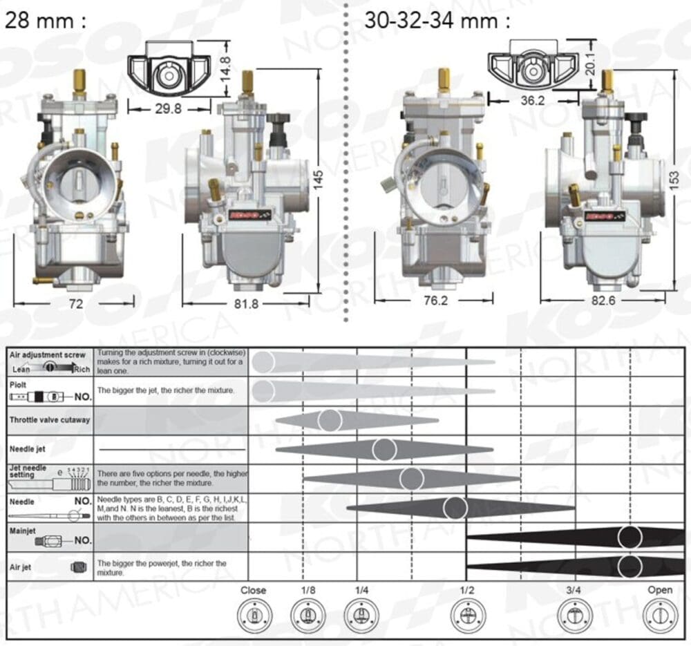 Koso’s KSR carburetor features a semi-flat D-shaped slide that increases the fuel flow for a better throttle reaction. It also reduces the incomplete combustion phenomenon, and therefore improves the combustion efficiency. Available in 3 different sizes and easy to adjust and install, this carburetor will allow you to set-up the ideal air/fuel ratio for better performance. Please select from 28mm, 30mm or 32mm.