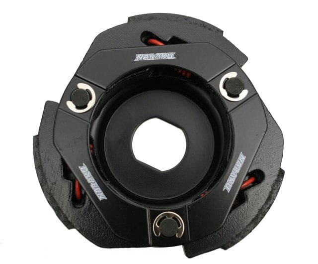 DESCRIPTION: Naraku Sport Clutch for GY6 125 and 150cc engines.The Naraku Sport Clutch Engages at a higher RPM than a stock clutch, allowing for better take-off from stops. Outer Diameter: 120mm Aramid Reinforced Clutch Shoes Engages 1500-2000 RPM Higher Than a Stock Clutch GY6 QMI/QMJ 152/157, Kymco, Various unlisted makes/models