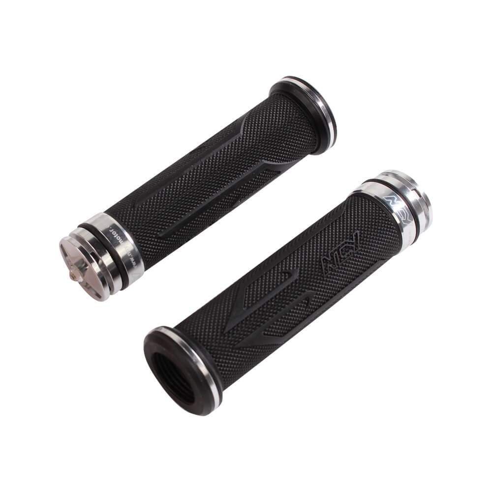 DESCRIPTION: These beautiful 22mm Aluminum Grip Sets from NCY come in a variety of colors, so you can express yourself and give your scooter a little color! We brought these in for the Honda Ruckus, but they’ll work great on any scooter with 7/8″ (22mm) bars. The center has a rhinestone to give it extra bling. Brand: NCYFits: UniversalMeasurement: 7/8″ or 22mmColor: Black