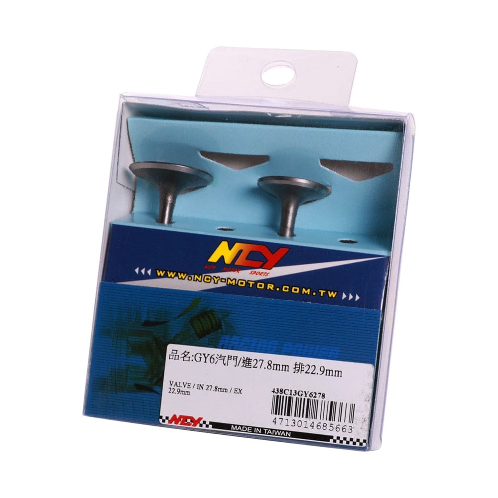 DESCRIPTION: High performance racing valves from NCY. These are a must for any serious tuner. With stainless construction and level seats, these scream quality and performance right out of the box. IN: Stem ø= 5.0mm Height = 65.75mm Valve ø= 28.0mm EX: Stem ø= 5.0mm Height = 65.3mm Valve ø= 23.0mmNot legal for use in California on pollution controlled vehicles. Check local laws before installing. This product is not intended for use on public roads or land.