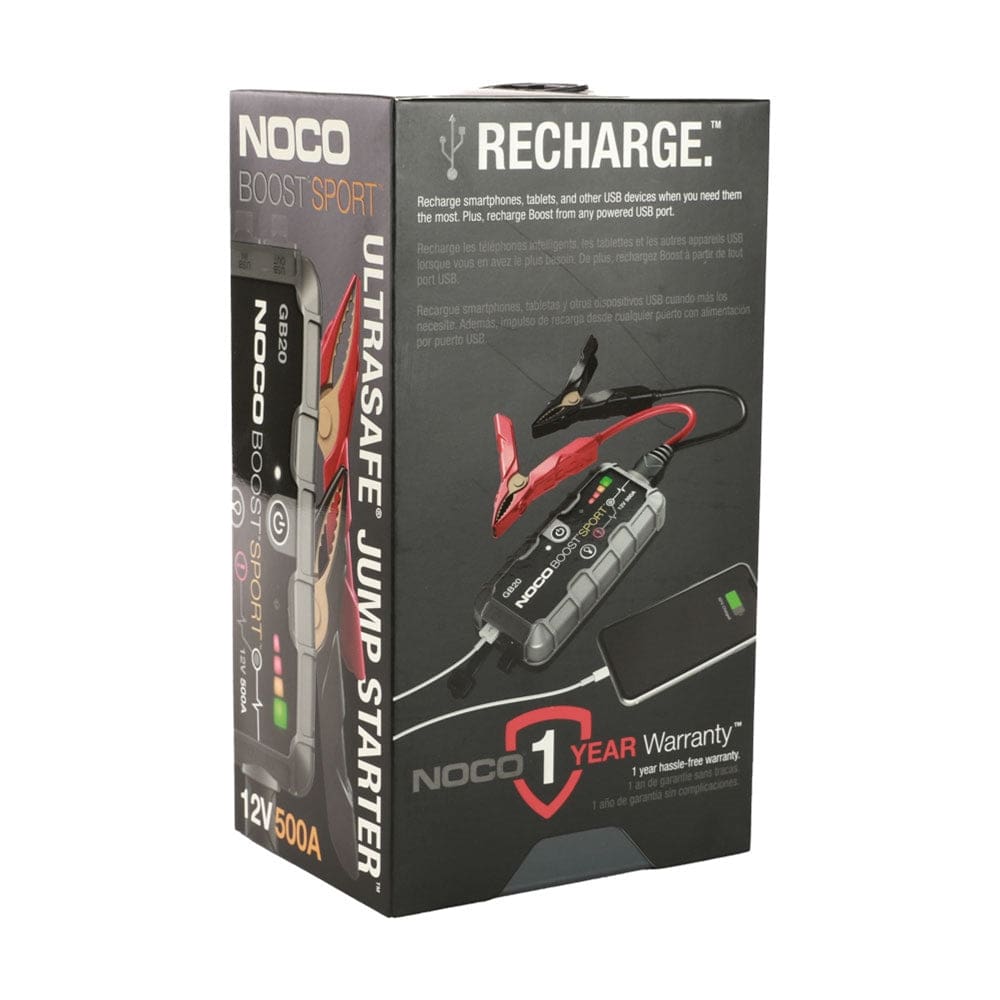 DESCRIPTION: The NOCO GB20 is a portable lithium-ion battery jump starter pack that delivers 500-amps for jump starting a dead battery in seconds. It features a patented safety technology that provides spark-proof connections and reverse polarity protection making safe and easy for anyone to use. It’s a powerful battery booster that doubles as a portable power source for recharging USB devices, like a smartphone, tablet and more. Designed for a car, boat, motorcycle, RV and more with gas engines up to 4 liters.