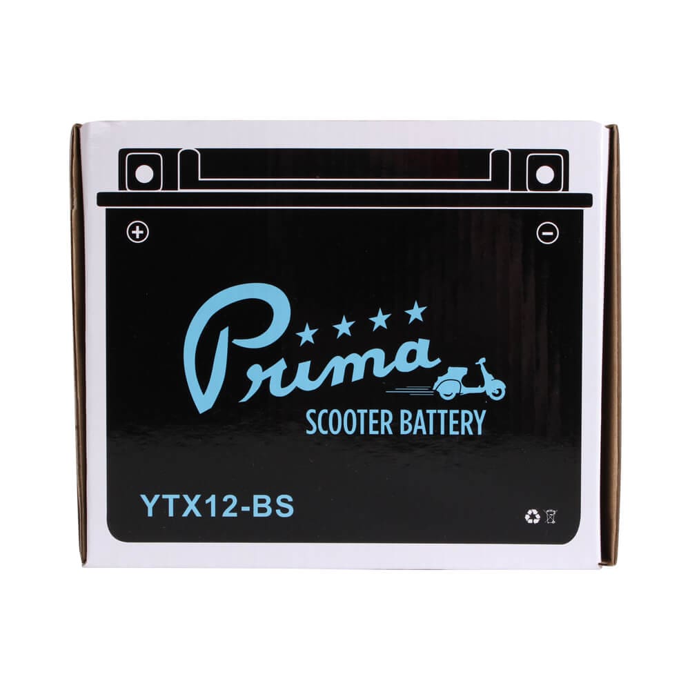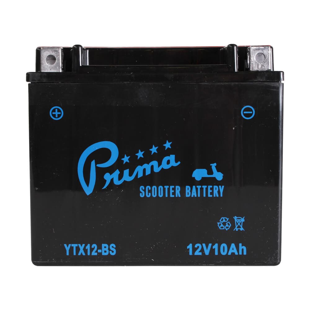DESCRIPTION: The Prima 12V TX12-BSMaintenance-Free acid-typebattery fits Vespa, Kymco and Honda bikes noted below. See the Compatibility table below and check ourBattery by Scooter Modelpage see if it fits your scooter.Original Parts For Scooters SKU 104-57Specifications:Voltage: 12V DCAmp Hours: 10AhCold Crank Amps (CCA): 180Type: Fresh pack, maintenance-freeLength: 6″Width: 3 1/2″Height: 5 1/8″Includes terminal hardware and acid cartridgesMust be charged before installingCompatibility:Vespa ET4Vespa GT200Vespa LX150 (2007 and later)Kymco People 250Kymco People 250sHonda Elite 250Honda HelixNote:If you live in a colder climate, we highly recommend using aNOCO Smart Battery Chargerto keep your batteries charged and help them survive the winter.About Prima:Prima is the industry leader in premium scooter accessories, service parts and scooterist protective apparel. Prima brand products are designed direct-fit for all popular scooter brands including Honda, Yamaha, Genuine, Vespa, SYM, Lance, KYMCO, Royal Alloy and GY6 / QMB powered scooters.*This product is not available for international or expedited shipping and will ship only via U.S. domestic ground. This product can only be shipped to the contiguous United States (lower 48 states and D.C.). International orders and orders bound for Alaska, Hawaii, or Puerto Rico for this item will be canceled.