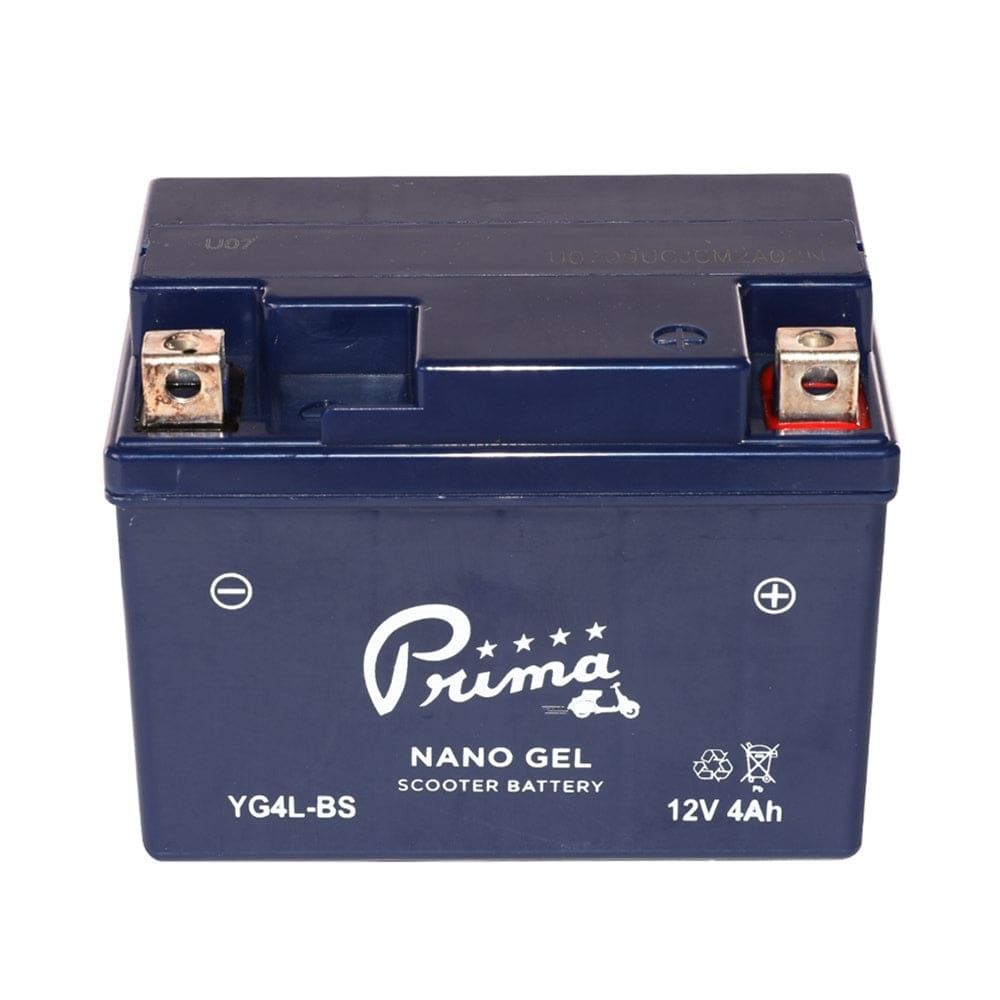 DESCRIPTION: Prima batteries are now available in factory activated gel versions – this 12V YG4L-BS version fits Vespa ET2 and Genuine RoughHouse 50 and Buddy 50 scooters. It comes prefilled, pre-charged and ready to install! Can be mounted in multiple positions, but not upside down. Original Parts For Scooters SKU 104-41Specifications:nVoltage: 12V DCnCold Crank Amps (CCA): 60nType: Nano gel, maintenance-freenLength: 4.5″nWidth: 3″nHeight: 3.5″nnCompatibility:nnGenuine RoughHouse 50nGenuine Buddy 50nnnVespa ET2nnn139QMB-based 50cc / 80cc engines with the following engine codes:nn139QMAn139QMBn1P39QMBn1P39QMA-2nnnYN139QMBnJJ1P39QMBn139FMA-2nBD1P39QMBnnnBN139QMBn147QMDnOther QMA modelsnOther QMB modelsnnDon’t see your engine listed? If the engine code includes “QM” or “FM”, this product is compatible with your vehicle.Note: If you live in a colder climate, we highly recommend using a NOCO Smart Battery Charger to keep your batteries charged and help them survive the winter.About Prima: Prima is the industry leader in premium scooter accessories, service parts and scooterist protective apparel. Prima brand products are designed direct-fit for all popular scooter brands including Honda, Yamaha, Genuine, Vespa, SYM, Lance, KYMCO, Royal Alloy and GY6 / QMB powered scooters. *This product is not available for international or expedited shipping and will ship only via U.S. domestic ground. This product can only be shipped to the contiguous United States (lower 48 states and D.C.). International orders and orders bound for Alaska, Hawaii, or Puerto Rico for this item will be canceled.nnSPECIFICATIONS: Specifications:nVoltage: 12V DCnCold Crank Amps (CCA): 60nType: Nano gel, maintenance-freenLength: 4.5″nWidth: 3″nHeight: 3.5″nnnnCOMPATIBILITY: Compatibility:nnGenuine RoughHouse 50nGenuine Buddy 50nnnVespa ET2nnn139QMB-based 50cc / 80cc engines with the following engine codes:nn139QMAn139QMBn1P39QMBn1P39QMA-2nnnYN139QMBnJJ1P39QMBn139FMA-2nBD1P39QMBnnnBN139QMBn147QMDnOther QMA modelsnOther QMB modelsnnDon’t see your engine listed? If the engine code includes “QM” or “FM”, this product is compatible with your vehicle.Note: If you live in a colder climate, we highly recommend using a NOCO Smart Battery Charger to keep your batteries charged and help them survive the winter.About Prima: Prima is the industry leader in premium scooter accessories, service parts and scooterist protective apparel. Prima brand products are designed direct-fit for all popular scooter brands including Honda, Yamaha, Genuine, Vespa, SYM, Lance, KYMCO, Royal Alloy and GY6 / QMB powered scooters. *This product is not available for international or expedited shipping and will ship only via U.S. domestic ground. This product can only be shipped to the contiguous United States (lower 48 states and D.C.). International orders and orders bound for Alaska, Hawaii, or Puerto Rico for this item will be canceled.nn139QMB ENGINES: 139QMB-based 50cc / 80cc engines with the following engine codes:nn139QMAn139QMBn1P39QMBn1P39QMA-2nnnYN139QMBnJJ1P39QMBn139FMA-2nBD1P39QMBnnnBN139QMBn147QMDnOther QMA modelsnOther QMB modelsnnDon’t see your engine listed? If the engine code includes “QM” or “FM”, this product is compatible with your vehicle.Note: If you live in a colder climate, we highly recommend using a NOCO Smart Battery Charger to keep your batteries charged and help them survive the winter.About Prima: Prima is the industry leader in premium scooter accessories, service parts and scooterist protective apparel. Prima brand products are designed direct-fit for all popular scooter brands including Honda, Yamaha, Genuine, Vespa, SYM, Lance, KYMCO, Royal Alloy and GY6 / QMB powered scooters. *This product is not available for international or expedited shipping and will ship only via U.S. domestic ground. This product can only be shipped to the contiguous United States (lower 48 states and D.C.). International orders and orders bound for Alaska, Hawaii, or Puerto Rico for this item will be canceled.nnMODEL FITMENTS: Brands: Amstar, Amigo, Ascend, Baotian, Bashan, Blade, Boom, Chicago Scooter Company, Dongfang, Roketa, Baotian, Bashan, BMS, Cool Sports, E Ton, Fly Wing, Eagle, Fly, Italica, Riya, Ice Bear, Jackel, Jet Moto, JCL, Taotao, Peace, JM Star, Jonway, Kazuma, Keeway, KMD, Kymco, Lance, Lifan, Linhai, Loncin, Longbo, Fuxin, Jiajue, Tao Tao, Tao Motors, Trailmaster, Maxtrade, Meitien, Motofino, Motorino, NST, Panterra, Panther, Qlink, Yiben, Red Streak, Redcat, Roketa, Schwinn, Strada, SYM, Tank, Terminator ,Tomberlin, TNG, United Motors, Vento, Vitacci, Wildfire, Wolf, X-Treme, X-Pro, Yongfu, ZNEN, Zhongneng , Zhilong, Geely, Wangye, ZH and more Manufactured by: Taizhou Zhongneng Motorcycle Co.; Jiangsu Zhongneng Motorcycle Co.; Jiangsu Meijunte Technology Co.; Taizhou Qianxin Vehicle Co.; Ningbo Dongfang Lingyun Vehicle Made Co.; Taizhou Zhilong Technology Co.; Zhejiang Jiajue Motorcycle Manufacturing Co.; Zhejiang Gelly Ming Industrial Co.; Taizhou City Senglong Motorcycle Manufacture Co.; Jiangsu Sacin Motorcycle Co.; Jiangsu Linhai Power Machinery Group Co.; Zheijiang TaoTao Vehicles Co.; Zhejiang Senling Motorcycle Co.; Sanmen County Yongfu Machine Co; Taizhou Jiaojiang Zhiwei Motorcycle Manufacture Co.; Huzhou Daixi Zhenhua Technology Trade Co.; Taizhou Zhongneng Motorcycle Co.; Zhejiang Riya Motorcycle Co.; Ningbo Longjia Motorcycle Co.; Taizhou Zhongneng Motorcycle Co.; and more
