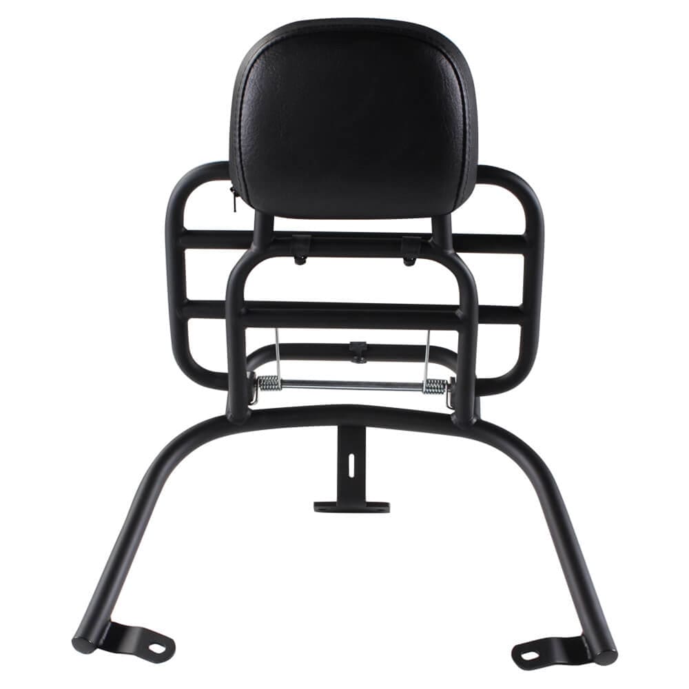 SPECIFICATIONS: Backrest and rear rack combinationBlack finish, also available inchromeRack folds up when not in useOverall dimensions: 20″L x 16.5″W x 13″HReuses existing hardware