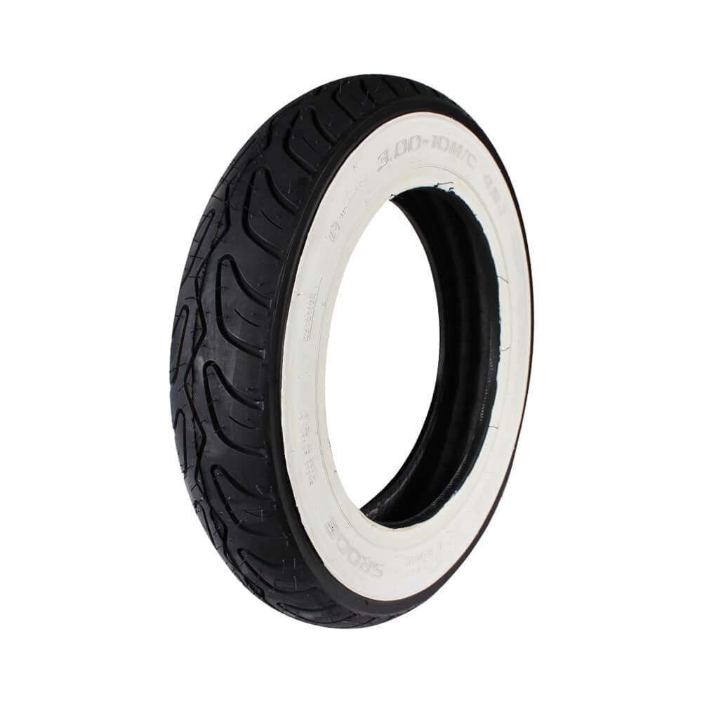 DESCRIPTION: The Prima Whitewall TUBELESS tire gives your Buddy 50, Buddy Kick, Pre-2013 Honda Metropolitan, Sym Mio, and other 10″ bikes a timeless look with superior performance.Specifications:Measurements: 3.0″ x 10″TubelessCan be run with a tube for vintage scooters using a 10″ tube type rimFits bikes equipped with 90/90-10 tiresCompatibility:Genuine Buddy 50Genuine Buddy KickPre-2013 Honda MetropolitanSym MioVespa VMA PrimaveraVespa V5A 50Vespa V9B 100 SportVespa V5B 50 SpecialVespa VMB ET3 125About Prima:Prima stands at the forefront of stylish, and reliable scooter accessories, service components, and protective gear for scooter enthusiasts. Products under the Prima brand are specifically engineered to fit seamlessly and color-match when appropriate with a wide range of well-known scooter manufacturers, such as Honda, Yamaha, Genuine, Vespa, SYM, Lance, KYMCO, Royal Alloy, and GY6/QMB powered scooters.Since its inception in 2006, Prima has consistently offered exceptional style, function, performance, and protection for both scooters and scooterists alike.