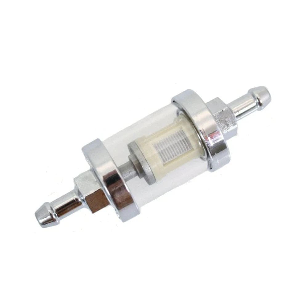 DESCRIPTION: SSP-G 1/4 Short Fuel Filter with Chrome Color Finish for most makes and models of vehicles. Unlike in-tank fuel filters, this filter will allow you to clean build up and debris. Overall Length: 87mm Hose End Outer Diameter: 6.5mm Cleanable Reusable Clear Case Most Makes/ Models