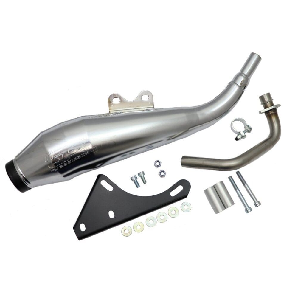 DESCRIPTION: Tecnigas GP4 Exhaust for scooters with 50cc 4-stroke, 2 valve head Piaggio engines.The Tecnigas GP4 is a sporty nickel plated exhaust that improves performance over the stock exhaust, all while being quiet and fairly light weight. Fits the following models with 4-stroke Piaggio 50cc engines with 2 valve heads: Aprilia: Scarabeo , Sport City One Derbi: Atlantis, Boulevard Piaggio: Fly, Liberty Vespa: LX50, Primavera, Modern S Head Pipe Bolt Hole Spacing: 40mm Head Pipe Inner Diameter: 18mm Includes Mounting Hardware and Instructional Booklet Piaggio, Vespa