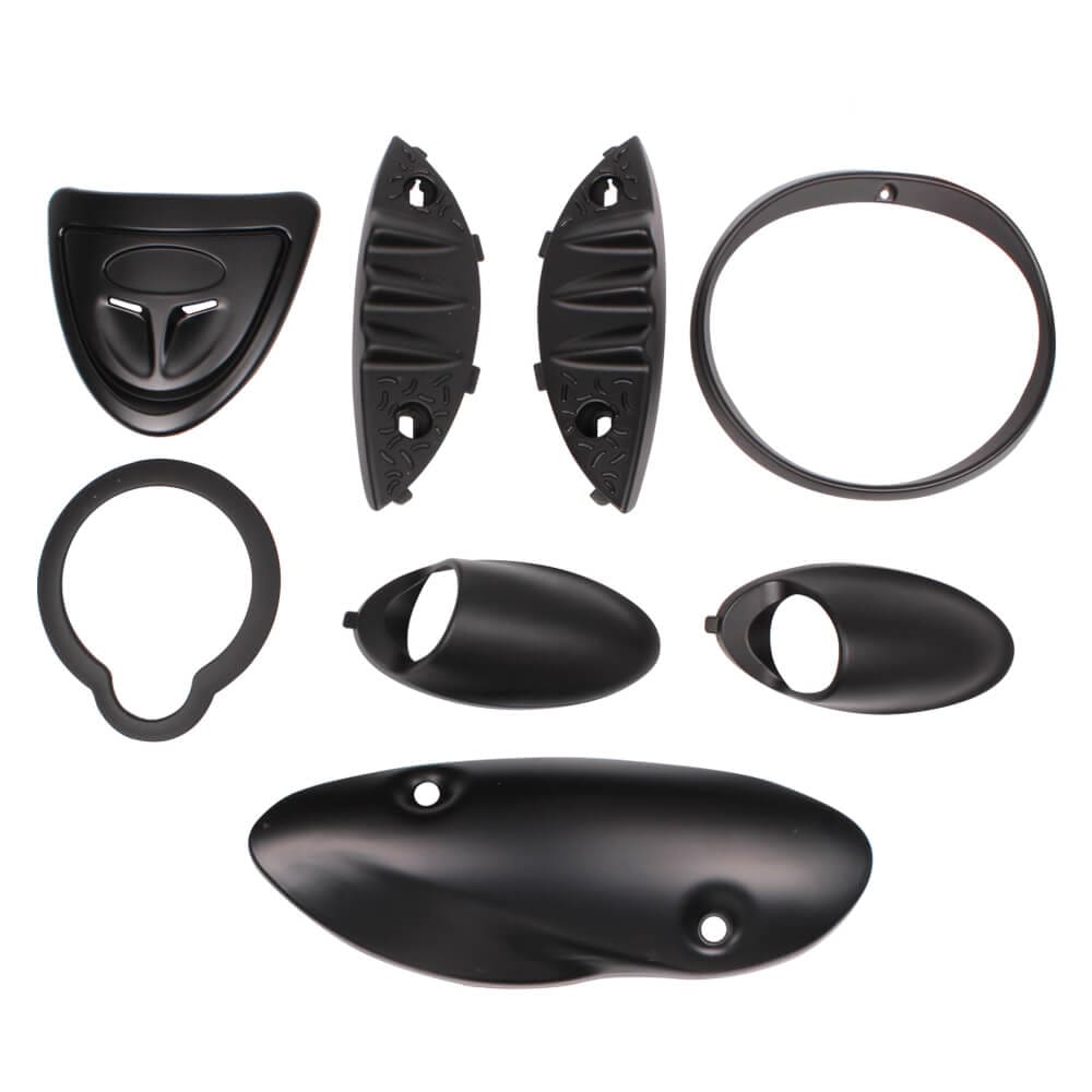 DESCRIPTION: The Genuine Buddy Trim Black Out Kit is perfect for anyone looking to darken the otherwise cheery demeanor of their 2007+ Buddy 50/125/150/170 scooter. The blackout kit for Buddy Kick 125 is available online.Chances are, if your Buddy has ever been knocked down, a few of these components could already use replacing. This kit is also less expensive than buying the standard chromed plastics. Take that, stock components! This kit does not include the black Buddy mirrors, available separately. Specifications: