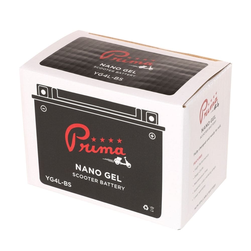 DESCRIPTION: Prima batteries are now available in factory activated gel versions – this 12V YG4L-BS version fits Vespa ET2 and Genuine RoughHouse 50 and Buddy 50 scooters. It comes prefilled, pre-charged and ready to install! Can be mounted in multiple positions, but not upside down. Original Parts For Scooters SKU 104-41Specifications: Voltage: 12V DC Cold Crank Amps (CCA): 60 Type: Nano gel, maintenance-free Length: 4.5 Width: 3 Height: 3.5 Compatibility: Genuine RoughHouse 50 Genuine Buddy 50 Vespa ET2 139QMB-based 50cc / 80cc engines with the following engine codes: 139QMA 139QMB 1P39QMB 1P39QMA-2 YN139QMB JJ1P39QMB 139FMA-2 BD1P39QMB BN139QMB 147QMD Other QMA models Other QMB models Don’t see your engine listed? If the engine code includes QM or FM, this product is compatible with your vehicle.Note: If you live in a colder climate, we highly recommend using a NOCO Smart Battery Charger to keep your batteries charged and help them survive the winter.About Prima: Prima is the industry leader in premium scooter accessories, service parts and scooterist protective apparel. Prima brand products are designed direct-fit for all popular scooter brands including Honda, Yamaha, Genuine, Vespa, SYM, Lance, KYMCO, Royal Alloy and GY6 / QMB powered scooters. *This product is not available for international or expedited shipping and will ship only via U.S. domestic ground. This product can only be shipped to the contiguous United States (lower 48 states and D.C.). International orders and orders bound for Alaska, Hawaii, or Puerto Rico for this item will be canceled.nnSPECIFICATIONS: Voltage: 12V DC Cold Crank Amps (CCA): 60 Type: Nano gel, maintenance-free Length: 4.5″ Width: 3″ Height: 3.5″nnCOMPATIBILITY: Genuine RoughHouse 50 Genuine Buddy 50 Vespa ET2 139QMB-based 50cc / 80cc engines with the following engine codes: 139QMA 139QMB 1P39QMB 1P39QMA-2 YN139QMB JJ1P39QMB 139FMA-2 BD1P39QMB BN139QMB 147QMD Other QMA models Other QMB models Don’t see your engine listed? If the engine code includes “QM” or “FM”, this product is compatible with your vehicle.Note: If you live in a colder climate, we highly recommend using a NOCO Smart Battery Charger to keep your batteries charged and help them survive the winter.About Prima: Prima is the industry leader in premium scooter accessories, service parts and scooterist protective apparel. Prima brand products are designed direct-fit for all popular scooter brands including Honda, Yamaha, Genuine, Vespa, SYM, Lance, KYMCO, Royal Alloy and GY6 / QMB powered scooters. *This product is not available for international or expedited shipping and will ship only via U.S. domestic ground. This product can only be shipped to the contiguous United States (lower 48 states and D.C.). International orders and orders bound for Alaska, Hawaii, or Puerto Rico for this item will be canceled.nn139QMB ENGINES: 139QMB-based 50cc / 80cc engines with the following engine codes: 139QMA 139QMB 1P39QMB 1P39QMA-2 YN139QMB JJ1P39QMB 139FMA-2 BD1P39QMB BN139QMB 147QMD Other QMA models Other QMB models Don’t see your engine listed? If the engine code includes “QM” or “FM”, this product is compatible with your vehicle.Note: If you live in a colder climate, we highly recommend using a NOCO Smart Battery Charger to keep your batteries charged and help them survive the winter.About Prima: Prima is the industry leader in premium scooter accessories, service parts and scooterist protective apparel. Prima brand products are designed direct-fit for all popular scooter brands including Honda, Yamaha, Genuine, Vespa, SYM, Lance, KYMCO, Royal Alloy and GY6 / QMB powered scooters. *This product is not available for international or expedited shipping and will ship only via U.S. domestic ground. This product can only be shipped to the contiguous United States (lower 48 states and D.C.). International orders and orders bound for Alaska, Hawaii, or Puerto Rico for this item will be canceled.nnMODEL FITMENTS: Amstar, Amigo, Ascend, Baotian, Bashan, Blade, Boom, Chicago Scooter Company, Dongfang, Roketa, Baotian, Bashan, BMS, Cool Sports, E Ton, Fly Wing, Eagle, Fly, Italica, Riya, Ice Bear, Jackel, Jet Moto, JCL, Taotao, Peace, JM Star, Jonway, Kazuma, Keeway, KMD, Kymco, Lance, Lifan, Linhai, Loncin, Longbo, Fuxin, Jiajue, Tao Tao, Tao Motors, Trailmaster, Maxtrade, Meitien, Motofino, Motorino, NST, Panterra, Panther, Qlink, Yiben, Red Streak, Redcat, Roketa, Schwinn, Strada, SYM, Tank, Terminator ,Tomberlin, TNG, United Motors, Vento, Vitacci, Wildfire, Wolf, X-Treme, X-Pro, Yongfu, ZNEN, Zhongneng , Zhilong, Geely, Wangye, ZH and more Manufactured by: Taizhou Zhongneng Motorcycle Co.; Jiangsu Zhongneng Motorcycle Co.; Jiangsu Meijunte Technology Co.; Taizhou Qianxin Vehicle Co.; Ningbo Dongfang Lingyun Vehicle Made Co.; Taizhou Zhilong Technology Co.; Zhejiang Jiajue Motorcycle Manufacturing Co.; Zhejiang Gelly Ming Industrial Co.; Taizhou City Senglong Motorcycle Manufacture Co.; Jiangsu Sacin Motorcycle Co.; Jiangsu Linhai Power Machinery Group Co.; Zheijiang TaoTao Vehicles Co.; Zhejiang Senling Motorcycle Co.; Sanmen County Yongfu Machine Co; Taizhou Jiaojiang Zhiwei Motorcycle Manufacture Co.; Huzhou Daixi Zhenhua Technology Trade Co.; Taizhou Zhongneng Motorcycle Co.; Zhejiang Riya Motorcycle Co.; Ningbo Longjia Motorcycle Co.; Taizhou Zhongneng Motorcycle Co.; and more