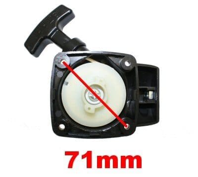 DESCRIPTION: Universal Parts Pull starter for 22.5cc-26cc 2-stroke engines. This is the most popular style of pullstarter used on small stand-up gas scooters such as the Zooma 22, Mosquito DX26, Tornado 22, Goped Sport, Martin Monster and many more. Bolt Hole Spacing: 49mm Diagonal Bolt Hole Spacing: 71mm