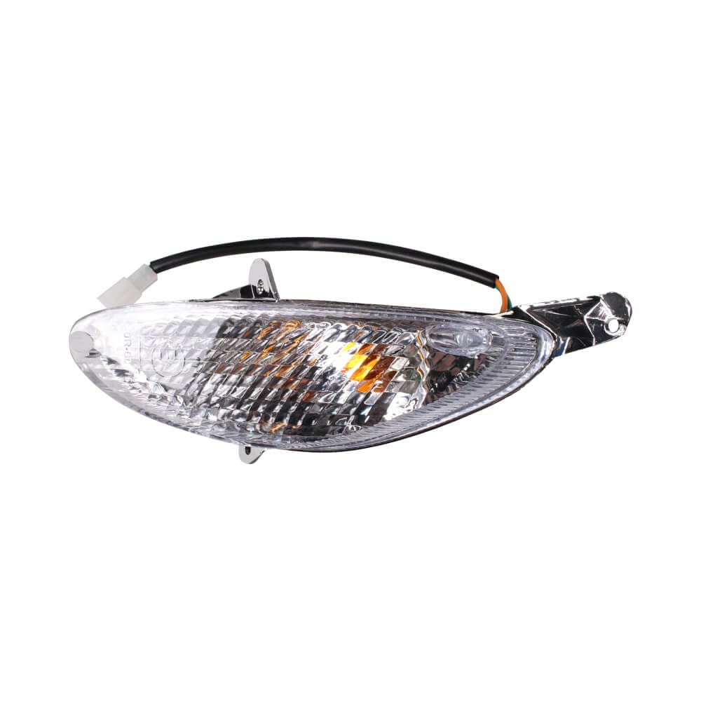 DESCRIPTION: This front left turn signal replaces stock equipment on CSC go and 139QMB 50cc Chinese scooters. See the compatibility table to ensure this works with your ride. Original Parts For Scooters SKU 134-16Specifications: Plug Style: 2-pin, male Clear lens Includes amber bulb Sits flush with the legshield Compatibility: CSC go scooters and those noted below139QMB-based 50cc / 80cc engines with the following engine codes: 139QMA 139QMB 1P39QMB 1P39QMA-2 YN139QMB JJ1P39QMB 139FMA-2 BD1P39QMB BN139QMB 147QMD Other QMA models Other QMB models Don’t see your engine listed? If the engine code includes QM or FM, this product is compatible with your vehicle.About CSC: Chicago Scooter Company embodies the spirit of urban mobility with its innovative and stylish lineup of scooters. Designed for city living, their scooters blend functionality, reliability, and modern design, making them the perfect choice for navigating busy streets. Experience the freedom of effortless commuting and explore the city in style with Chicago Scooter Company.nnSPECIFICATIONS: Plug Style: 2-pin, male Clear lens Includes amber bulb Sits flush with the legshieldnnCOMPATIBILITY: CSC go scooters and those noted below139QMB-based 50cc / 80cc engines with the following engine codes: 139QMA 139QMB 1P39QMB 1P39QMA-2 YN139QMB JJ1P39QMB 139FMA-2 BD1P39QMB BN139QMB 147QMD Other QMA models Other QMB models Don’t see your engine listed? If the engine code includes “QM” or “FM”, this product is compatible with your vehicle.About CSC: Chicago Scooter Company embodies the spirit of urban mobility with its innovative and stylish lineup of scooters. Designed for city living, their scooters blend functionality, reliability, and modern design, making them the perfect choice for navigating busy streets. Experience the freedom of effortless commuting and explore the city in style with Chicago Scooter Company.nn139QMB ENGINES: 139QMB-based 50cc / 80cc engines with the following engine codes: 139QMA 139QMB 1P39QMB 1P39QMA-2 YN139QMB JJ1P39QMB 139FMA-2 BD1P39QMB BN139QMB 147QMD Other QMA models Other QMB models Don’t see your engine listed? If the engine code includes “QM” or “FM”, this product is compatible with your vehicle.About CSC: Chicago Scooter Company embodies the spirit of urban mobility with its innovative and stylish lineup of scooters. Designed for city living, their scooters blend functionality, reliability, and modern design, making them the perfect choice for navigating busy streets. Experience the freedom of effortless commuting and explore the city in style with Chicago Scooter Company.nnMODEL FITMENTS: Amstar, Amigo, Ascend, Baotian, Bashan, Blade, Boom, Chicago Scooter Company, Dongfang, Roketa, Baotian, Bashan, BMS, Cool Sports, E Ton, Fly Wing, Eagle, Fly, Italica, Riya, Ice Bear, Jackel, Jet Moto, JCL, Taotao, Peace, JM Star, Jonway, Kazuma, Keeway, KMD, Kymco, Lance, Lifan, Linhai, Loncin, Longbo, Fuxin, Jiajue, Tao Tao, Tao Motors, Trailmaster, Maxtrade, Meitien, Motofino, Motorino, NST, Panterra, Panther, Qlink, Yiben, Red Streak, Redcat, Roketa, Schwinn, Strada, SYM, Tank, Terminator ,Tomberlin, TNG, United Motors, Vento, Vitacci, Wildfire, Wolf, X-Treme, X-Pro, Yongfu, ZNEN, Zhongneng , Zhilong, Geely, Wangye, ZH and more Manufactured by: Taizhou Zhongneng Motorcycle Co.; Jiangsu Zhongneng Motorcycle Co.; Jiangsu Meijunte Technology Co.; Taizhou Qianxin Vehicle Co.; Ningbo Dongfang Lingyun Vehicle Made Co.; Taizhou Zhilong Technology Co.; Zhejiang Jiajue Motorcycle Manufacturing Co.; Zhejiang Gelly Ming Industrial Co.; Taizhou City Senglong Motorcycle Manufacture Co.; Jiangsu Sacin Motorcycle Co.; Jiangsu Linhai Power Machinery Group Co.; Zheijiang TaoTao Vehicles Co.; Zhejiang Senling Motorcycle Co.; Sanmen County Yongfu Machine Co; Taizhou Jiaojiang Zhiwei Motorcycle Manufacture Co.; Huzhou Daixi Zhenhua Technology Trade Co.; Taizhou Zhongneng Motorcycle Co.; Zhejiang Riya Motorcycle Co.; Ningbo Longjia Motorcycle Co.; Taizhou Zhongneng Motorcycle Co.; and more