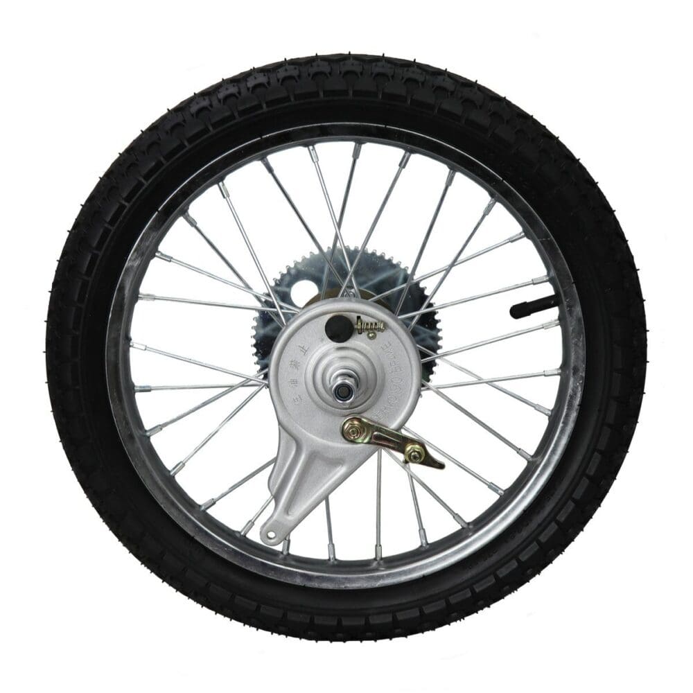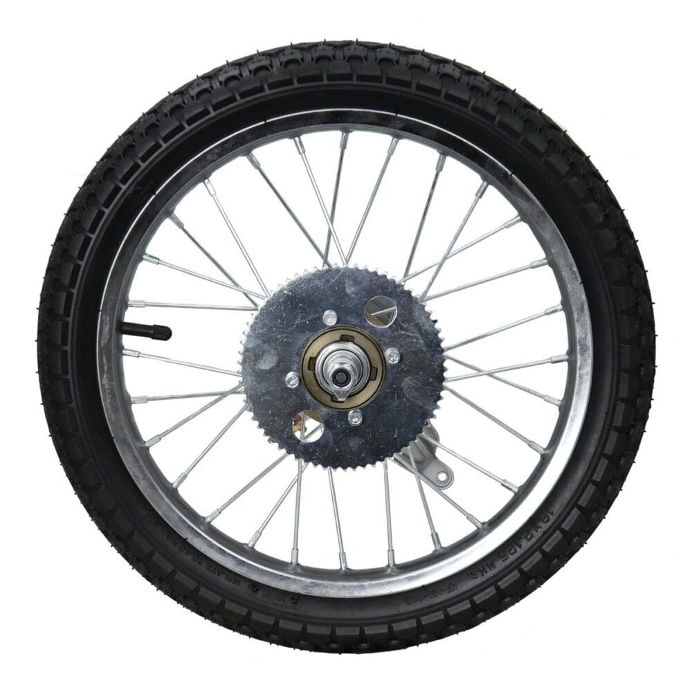 DESCRIPTION: Universal Parts 16 Rear Wheel Assembly for Razor EcoSmart Metro. Razor # W13114501048 Tire Size: 16 x 2.125 inches Includes Tire, Tube, Wheel, Axle, 65 Tooth Sprocket and Freewheel, and Brake Requires Assembly Brake Assembly Goes on The Shorter Threads Sprocket Assembly Goes on The Longer Threads Razor EcoSmart MetroEcoSmart Metro