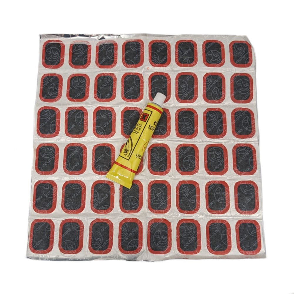 DESCRIPTION: Universal Parts Tire and Tube Cold Patch Kit Includes: Rubber cement 48 patches Dimensions: 33mm x 24mm Most Makes/ Models